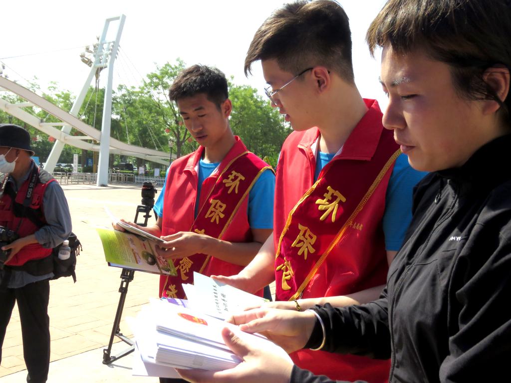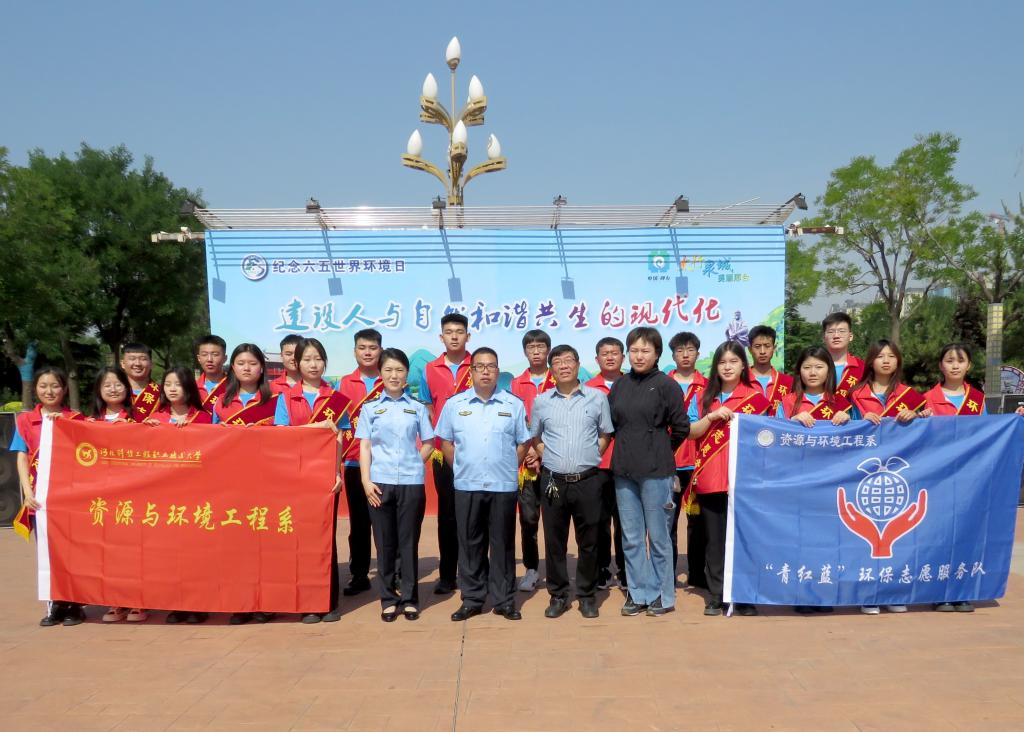 6月5日,在邢台市体育公园东门广场,资源与环境工程系书记赵建国和辅导员带领best365“青红蓝”环保志愿服务队参加邢台市六五环境日系列宣传活动。
