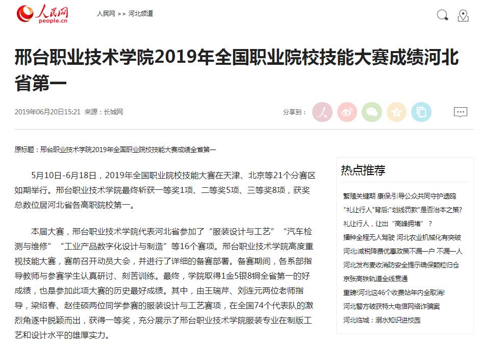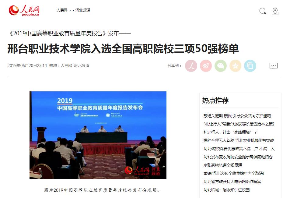 6月20日,人民网刊登题为《邢台职业技术学院2019年全国职业院校技能大赛成绩河北省第一》《邢台职业技术学院入选全国高职院校三项50强榜单》的报道,连续发文两篇报道我院办学成果。