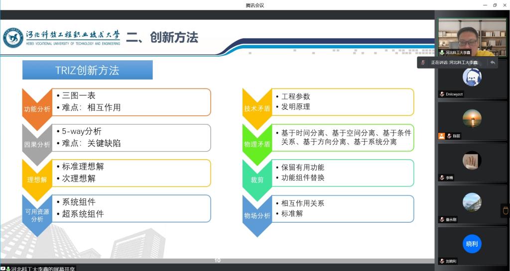 教师李鑫作为主讲,介绍了创新方法的由来及实施过程。TRIZ是前苏联根里奇·阿奇舒勒和他的研究团队,通过分析大量专利和创新案例总结出来的一种创新方法。TRIZ可以快速地帮助广大科研工作者在遇到难题的时候得到新的思路和灵感,并帮助科研工作者克服难题,找到解决方案。老师在教育教学中,将创新方法和思维传授给学生极其重要,从而引导同学们在创新创业中发挥自己的作用,实现自己的梦想、达成自己的抱负。