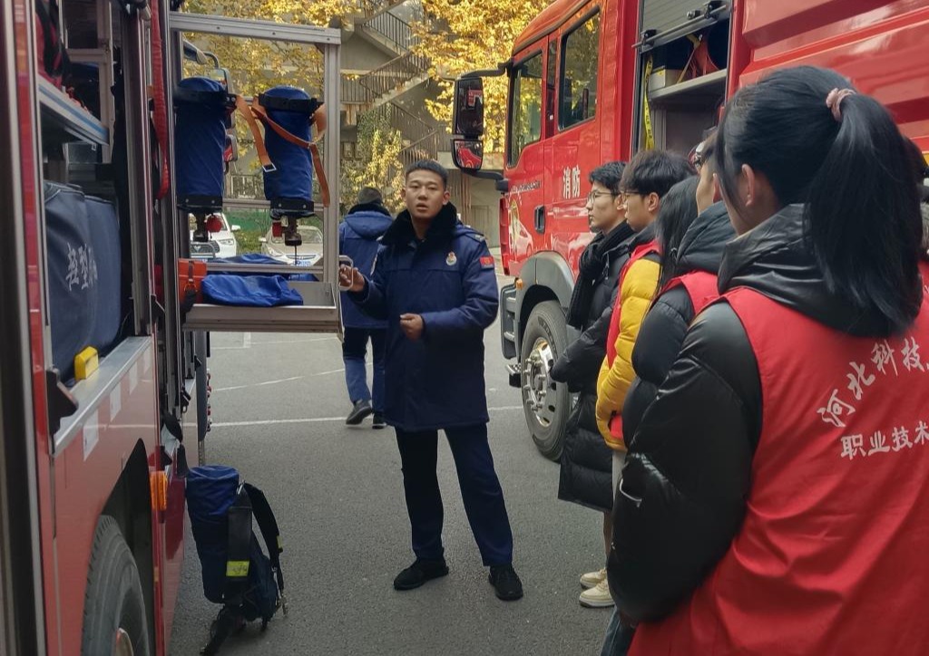 开展“消防大培训”“消防大联动”“消防大体验”活动。学校特邀请安宣服务中心卢向辉教官作校园消防安全知识专题培训;邀请邢台市泉北大街消防中队“进校园”开展消防宣传;信息工程系带学生前往邢台市信都区钢铁北路消防救援大队参观学习,亲自体验穿戴消防服、使用空气呼吸器等装备,亲自操作消防栓和灭火器等消防器材。
