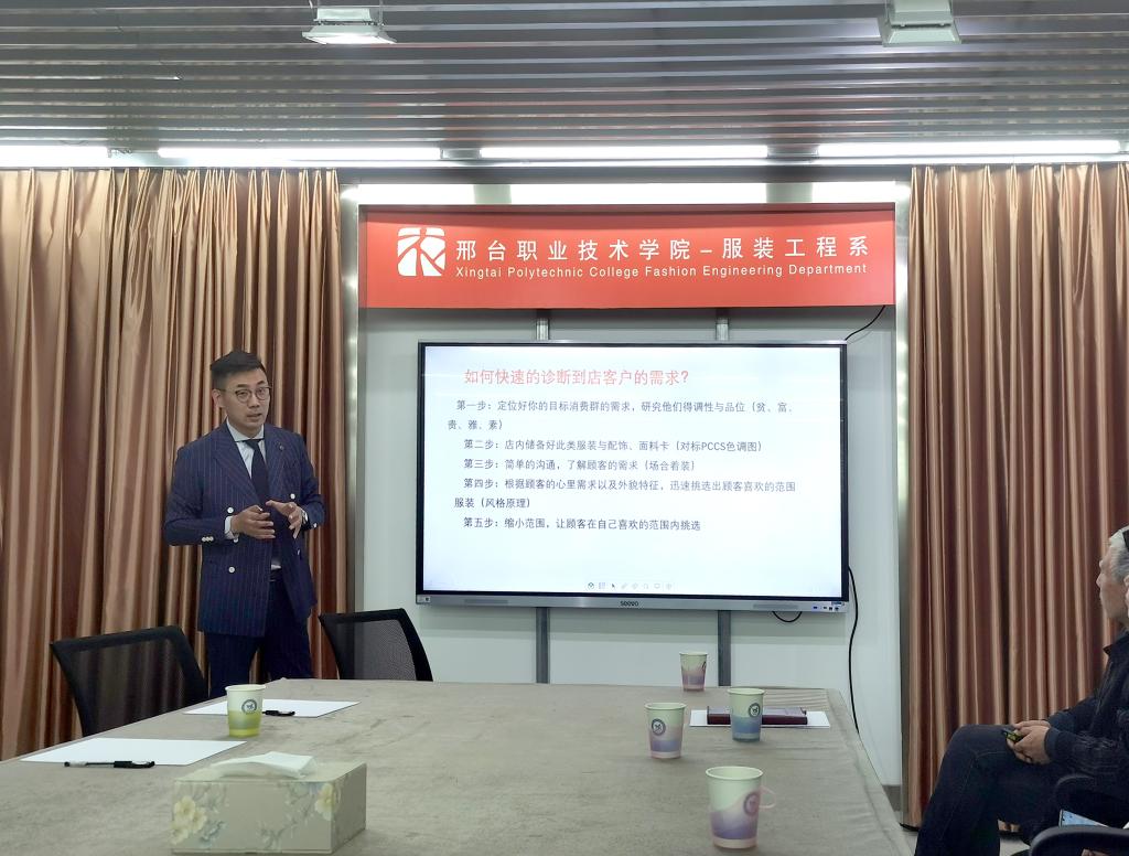 路阳副总经理为服装工程系师生讲解“普兰尼奥男装高级定制”,介绍了2021-2022男装流行趋势以及最新的男装全麻衬、半麻衬工艺技术,提升了男装高级定制的产品价值。拓宽了服装系男装高级定制人才培养的新领域。