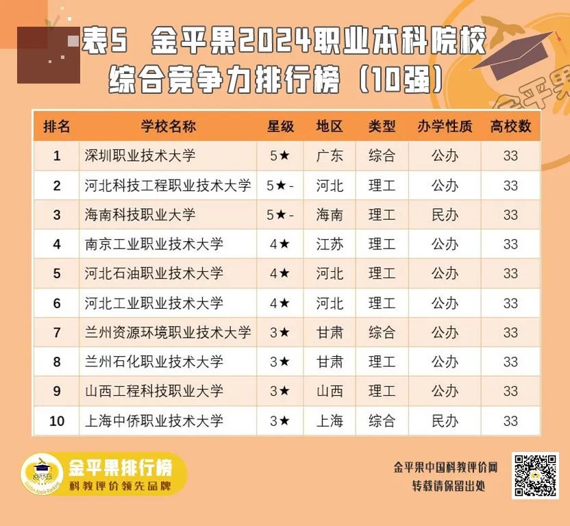 这也是“金平果排行榜”(又称“中评榜”)连续第十三次发布高职院校综合竞争力评价结果、第四次发布职业本科院校综合竞争力评价结果。2024年“金平果”中评榜突出“双高”建设背景,坚持质量第一、效益优先和中国特色为重的评价标准,评价指标体系由思政建设、办学条件、师资力量、科教产出、学校声誉等一级指标组成,其中学校声誉又包含双高建设、优质校、示范骨干、社会荣誉、产教融合、创新创业、科技奖励、教改试点、本科教育等二级指标,产教融合二级指标中新增了专业合作建设试点、校企合作和现代产业学院建设等观测点,创新创业二级指标中增加了双创学院、实践基地、优秀成果、典型案例等观测点,5个一级指标、35个二级指标、100多个观测点全面反映了高职院校的综合竞争能力。