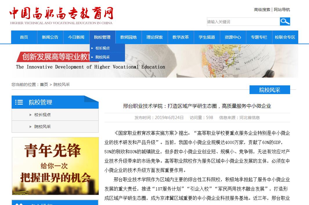 6月24日,中国高职高专教育网刊登《邢台职业技术学院:打造区域产学研生态圈,高质量服务中小微企业》一文,再次报道我院办学成果。
