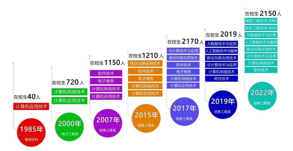 2007年7月,学院结合市场岗位需求、适应IT产业发展的需要将电子工程系拆分为信息工程系和电气工程系。2009年开设嵌入式系统工程专业。2022年开设本科专业网络工程技术和软件工程技术。下图是信息工程系历史沿革图。