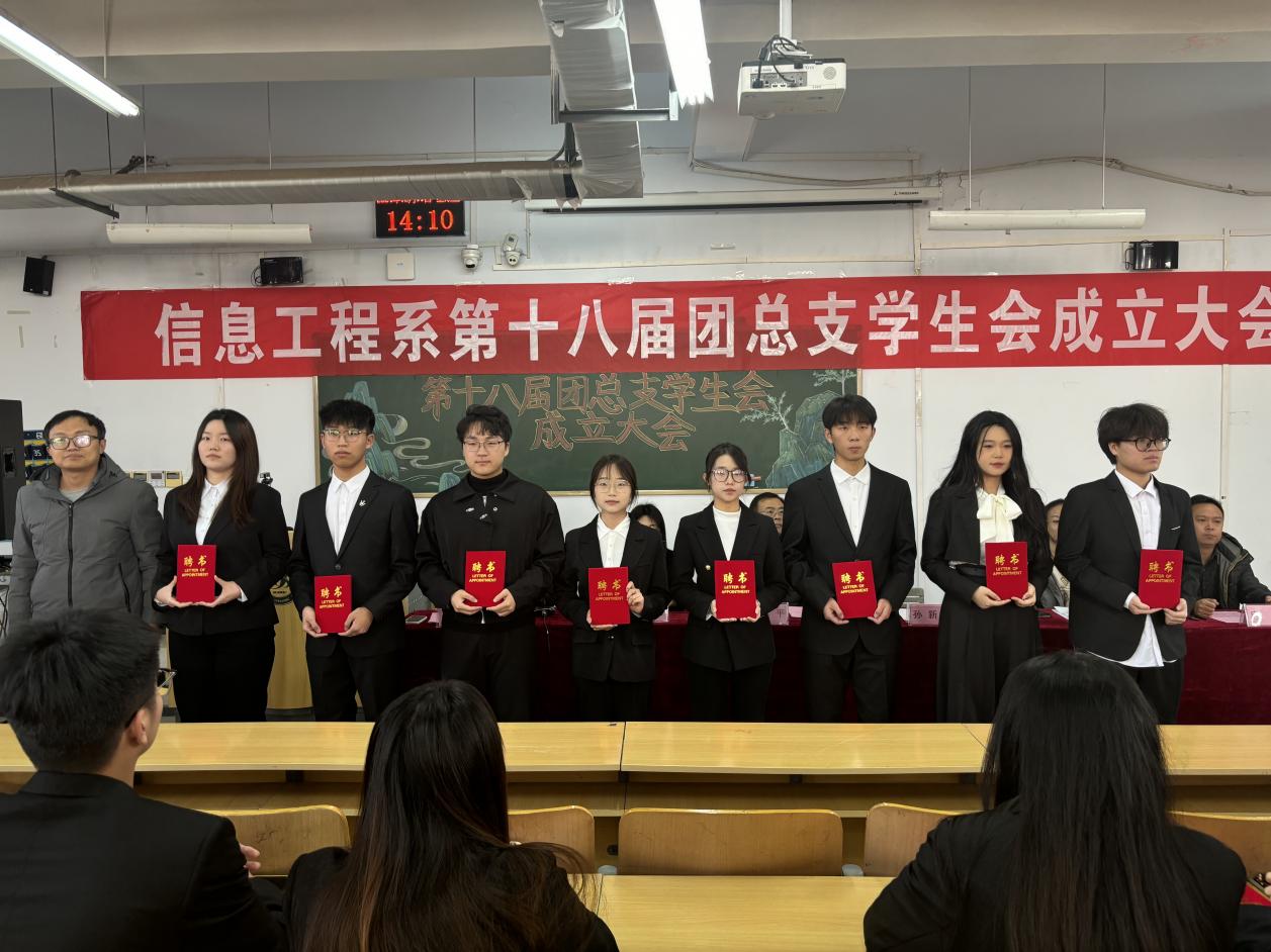 会议伊始,全体起立奏唱团歌《光荣啊,中国共青团》。随后,张玉丹老师宣读了《信息工程系关于第一届党团服务中心学生干部任命的决定》、孙新博老师宣读了《信息工程系关于第十八届团总支学生会干部任命的决定》、钱伟老师宣读了《信息工程系关于2024级班委任命的决定》。徐建平书记和各位老师分别为第十八届团总支学生会主要干部代表、2024级班干部代表颁发了聘书。王媛媛代表系第十七届团总支学生会作卸任发言,她表示时光如白驹过隙,过去一年的团总支学生会生活充实丰富,收获了成长和经验,并对新一届团总支学生会送出衷心的祝贺和美好的祝福。随后安逸冉代表第十八届团总支学生会作上任发言,她表示新一届的团总支学生会将传递第十七届团总支学生会的荣誉,传承优秀品质,秉持初心,团结一致,为信息工程系发展贡献力量。