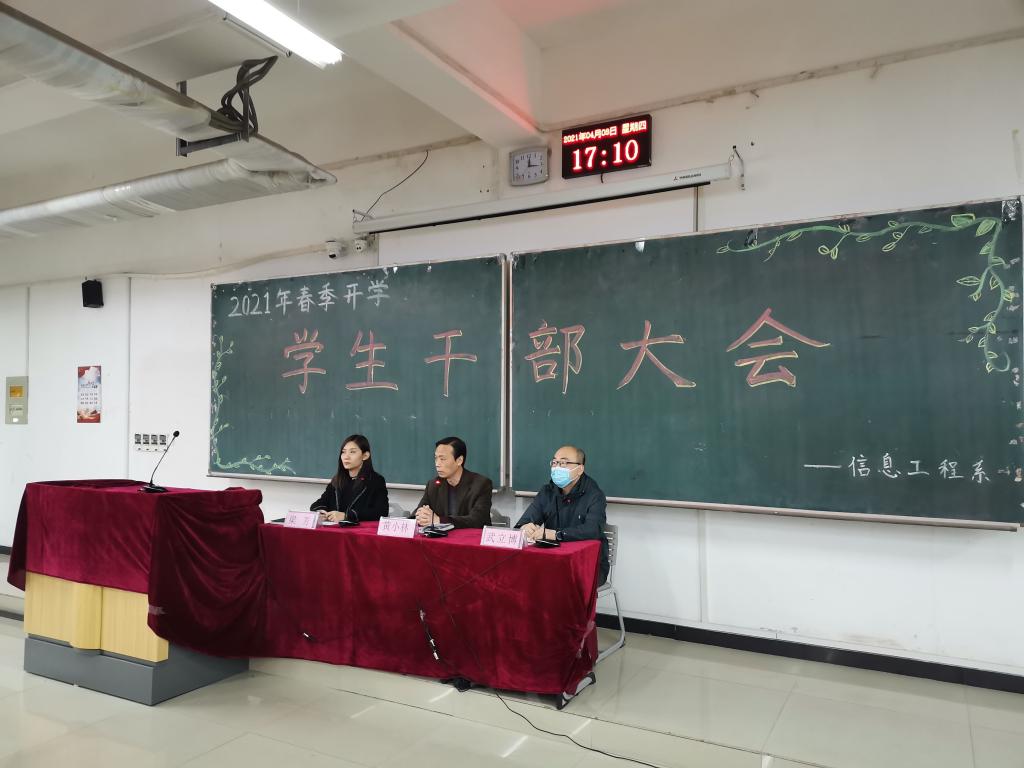 辅导员老师分别宣读了《信息工程系关于对2020-2021学年第一学期学习成绩优秀班集体和专业学习标兵的表彰决定》《信息工程系关于对2020-2021学年寒假抗击新冠肺炎疫情一线优秀学生的表彰决定》《信息工程系关于对2021年春季光荣入伍学生的表彰决定》,希望全体学生干部以受表彰的先进集体和个人为榜样,积极进取,全面发展。