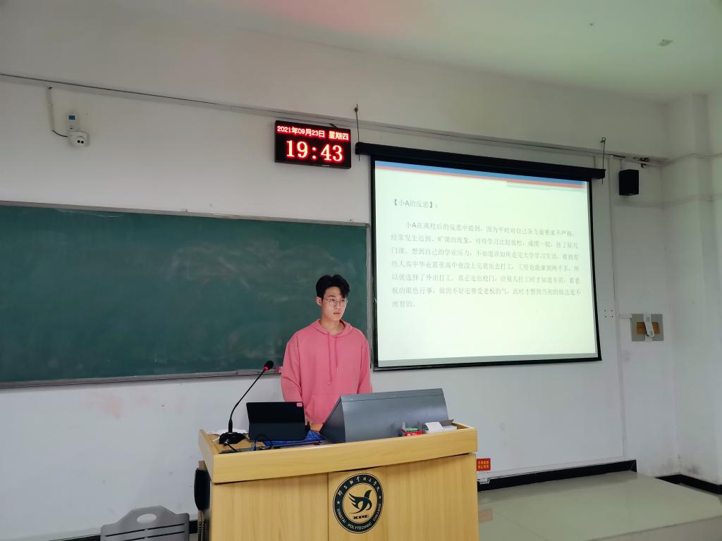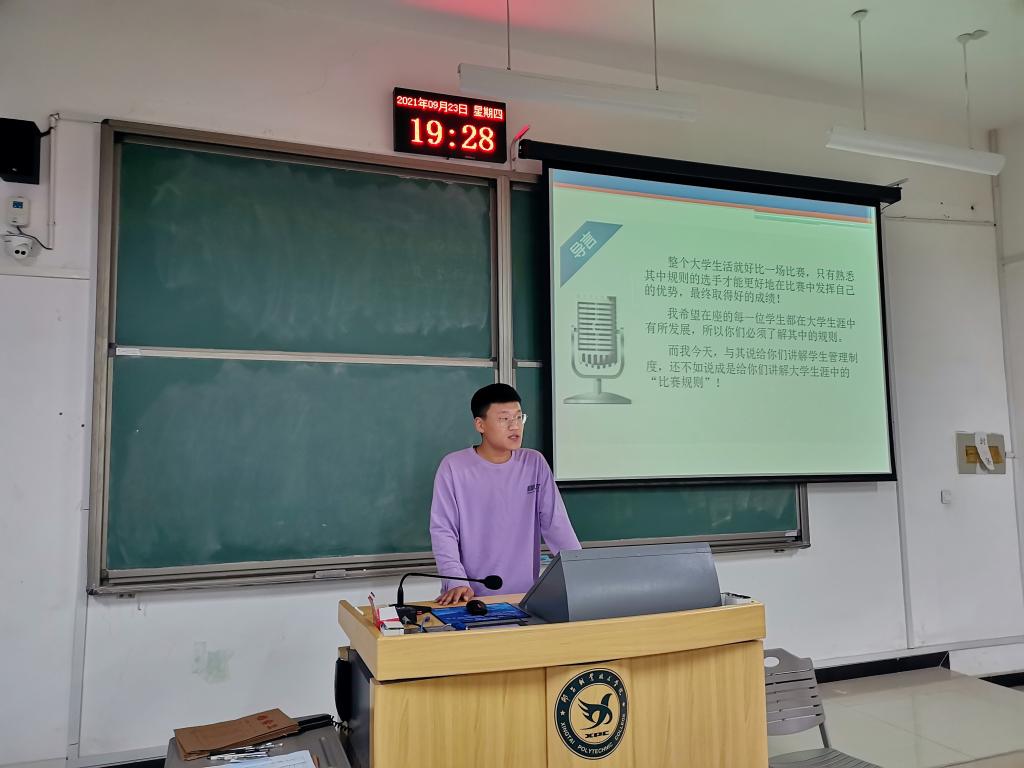 为帮助新生更好地适应大学新生活,9月23日晚,我系于C区4层新生班级自习教室开展了2021级新生学生管理制度教育会,讲解会由新生指导员、带班员以及全体2021级新生参加,各班指导员主讲。