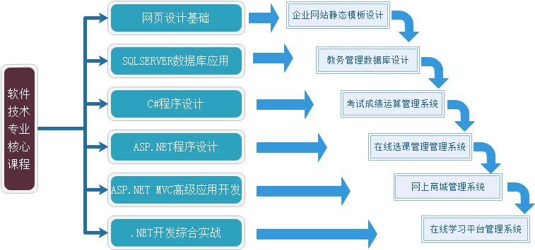 软件技术专业按照“对国标、促校企、优体系”的建设思路,根据职教20条及国家专业标准,整合校企合作成果的课程资源建设,优化和完善专业体系,推行“1+6+6+N”项目式教学”,即:1个专业、6门核心课程、6项课程项目和多个项目式任务工单。