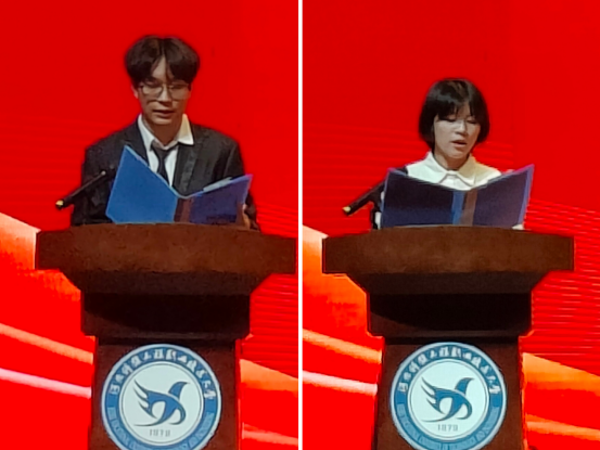 表彰过后,由学生代表软件本2303班崔济麟和新生代表软件本2405班张心怡上台发言,他们表示要恪守“德能并蓄,敏行担当”的校训,始终秉持“生命不息、奋斗不止”的人生态度,在科工大美丽校园尽情绽放,书写自己的精彩人生。