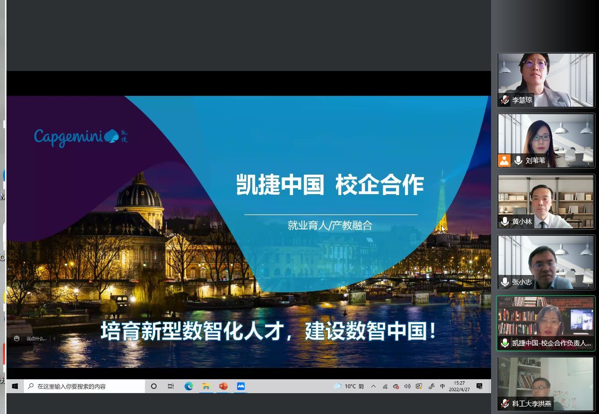 4月27日下午,信息工程系与凯捷咨询(中国)有限公司校企线上互访会如约举行。凯捷(中国)校企合作总负责人毕晓晖、华北区校企合作主管刘苇苇,信息系党总支书记黄小林、副主任张小志、大数据教研室主任李洪燕、系就业指导办李慧琼参加会议。