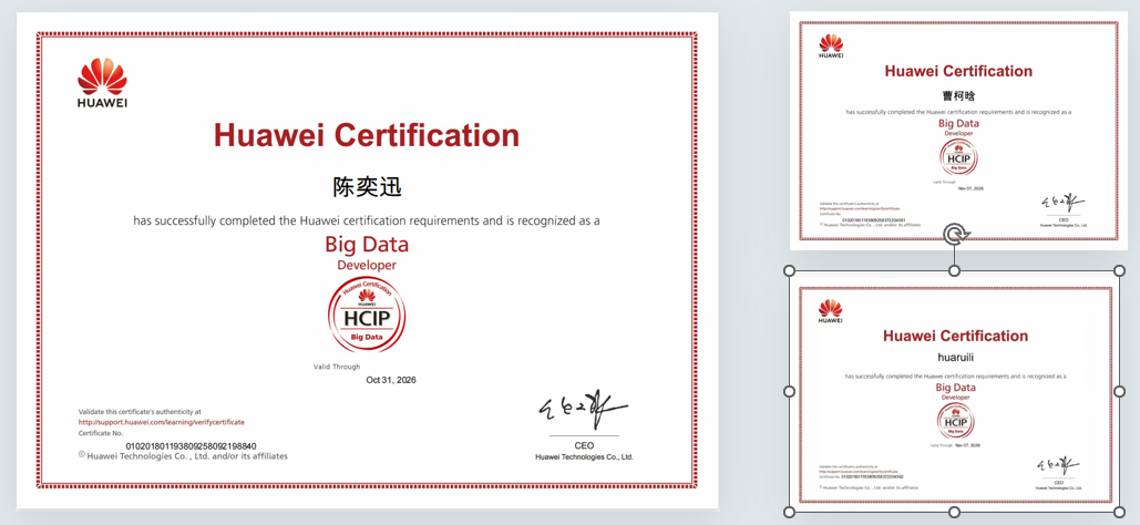 近日,best365中国官方网站信息工程系大数据技术专业学生陈奕迅、李华蕊、曹柯晗三位同学凭借出色的表现,成功通过了华为HCIP开发者认证考试,华为作为全球领先的ICT解决方案供应商,其HCIP开发者认证得到了全球行业的广泛认可,拥有华为HCIP-Big Data认证将为学生在寻求大数据相关工作时提供强有力的竞争优势。