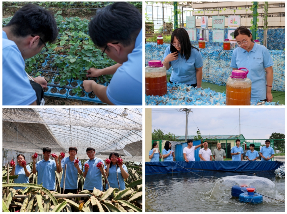 团队成员还走进安陵镇博隆生态园、北留智镇凯骏农业园和龙华镇“鱼菜共生”产业园,踏上了探索农业生态文化之旅。在博隆生态园体验了有机蔬菜的种植和采摘;在凯骏农业园学习了智能温室管理和运营;在鱼菜共生产业园见证了循环农业的高效与环保。同学们对现代农业有了更加直观的认识和了解,也激发了他们投身乡村振兴事业的热情和信心。