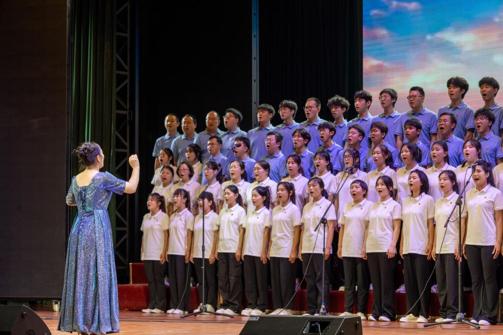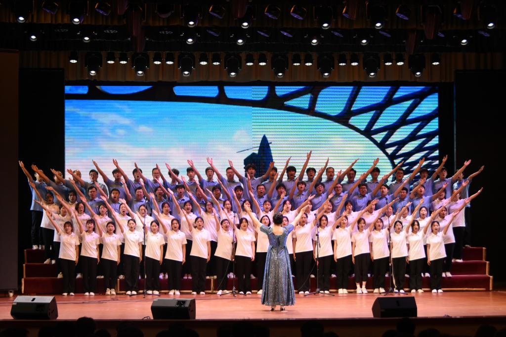 大会现场,我系师生着装整齐、精神抖擞。当他们唱响《在灿烂的阳光下》时,优美的旋律如同一股清泉流淌在每个人的心间。我系师生通过精心编排的和声、富有感染力的舞台表现,将歌曲中蕴含的对党的感恩之情和对未来的美好憧憬表达得淋漓尽致。“从小爷爷对我说,吃水不忘挖井人。曾经苦难才明白,没有共产党哪有新中国。”朴实的歌词,深情的演唱,仿佛将中国共产党百年的奋斗历程和辉煌成就一一展现在观众眼前。