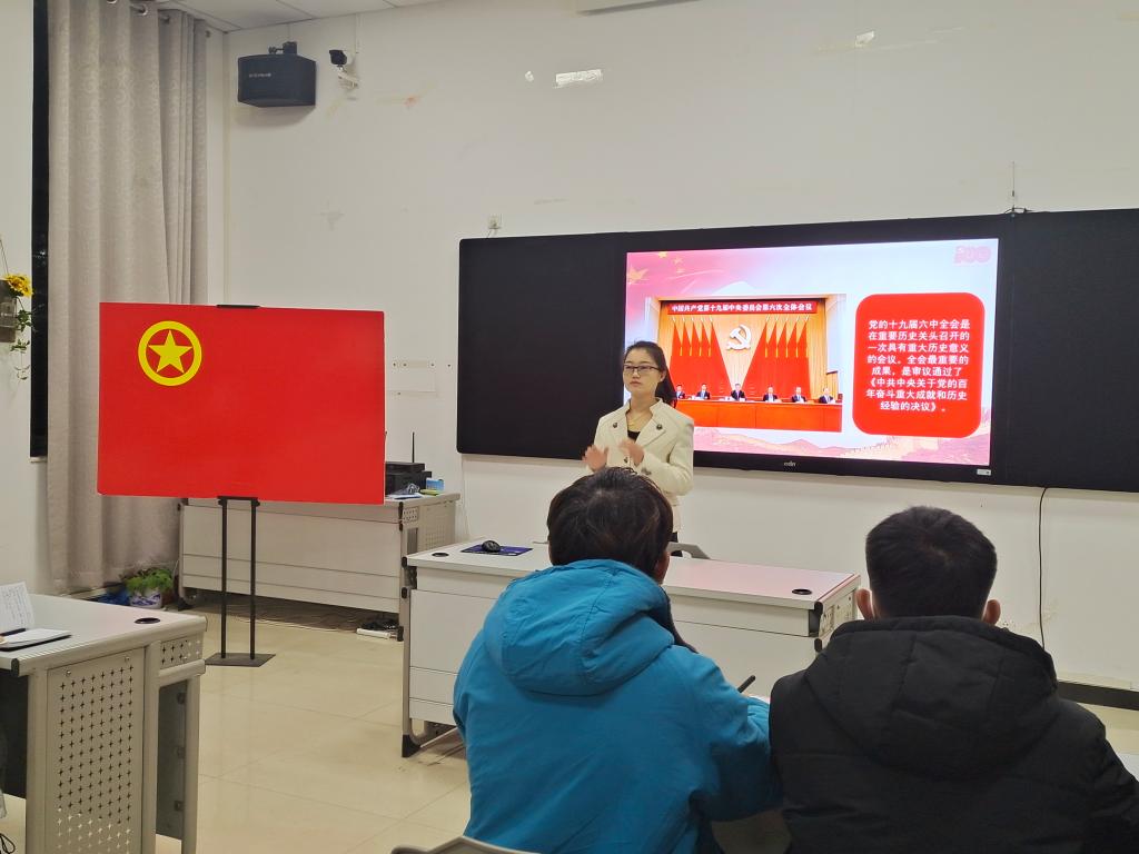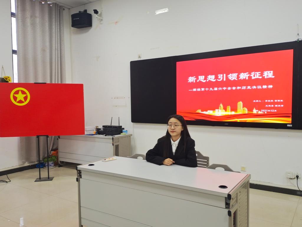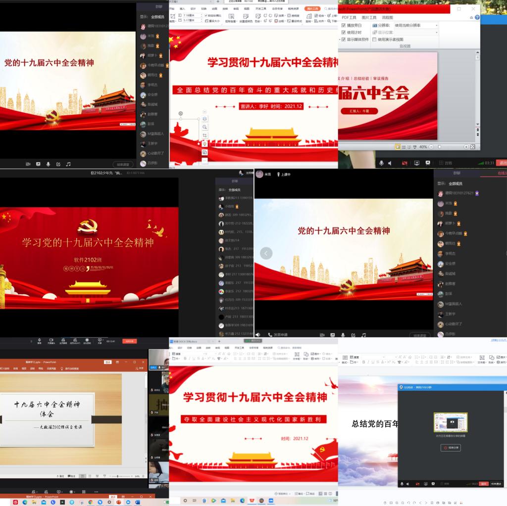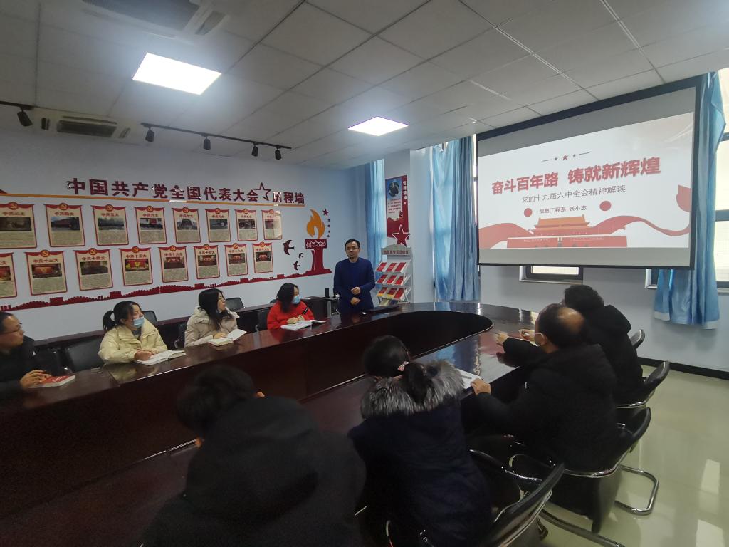 11月22日,系党总支书记黄小林以“以史为鉴,开创未来”为主题,为全系师生党员解读了党的十九届六中全会精神;12月7日,系党总支书记黄小林结合党的十九届六中全会精神,为移动2101班、移动2102班学生主讲了形势与政策课;12月25日,系主任王学东以“在新的赶考路上创造新的辉煌”为题,结合学校发展规划和系部工作,为全系教工宣讲了党的十九届六中全会精神;12月17日,系党总支副书记武立博以“感悟全会精神,赓续百年荣光”为题,为智能2102班学生主讲了党的十九届六中全会精神主题党课;12月24日,系副主任张小志以“奋斗百年路,铸就新辉煌”为题,为教工党支部成员讲解了党的十九届六中全会精神。