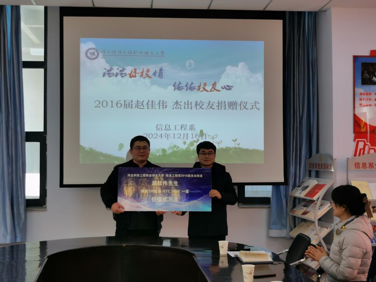 2024年12月16日,赵佳伟校友支持信息工程系建设捐赠仪式在系二楼党员活动室举行,系党总支书记徐建平、系主任冯磊、系副主任张小志及教师代表参加捐赠仪式。校友赵佳伟秉承回馈社会与感恩母校的初心,向母校捐赠了一套先进的VR设备,用于教学与科研,助力信息工程系在数字化教学领域的进一步发展。