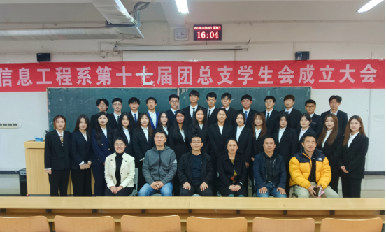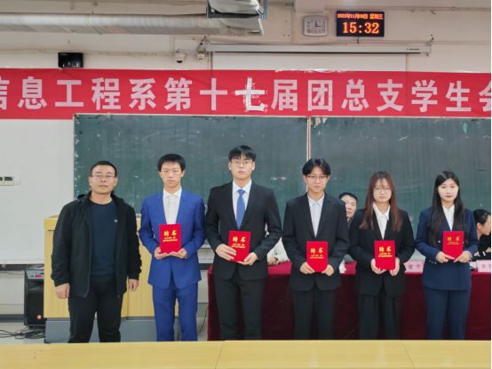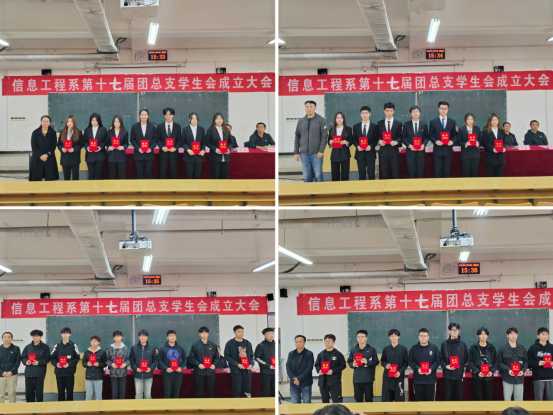 会议伊始,全体起立奏唱团歌《光荣啊,中国共青团》。随后,侯建老师宣读了《信息工程系关于第十七届团总支、学生会干部任命的决定》,李慧琼老师宣读了《信息工程系关于2023级班委任命的决定》。徐建平书记和各位老师分别为第十七届团总支学生会主要学生干部代表、2023级班级干部代表颁发了聘书。孙嘉超代表系第十六届团总支学生会作卸任发言,他表示本届团总支学生会工作虽有着不错的表现,但仍存在不足之处,希望新一届团总支学生会能够吸取经验,积极工作,取得更好的成绩。王媛媛代表系第十七届团总支学生会作上任发言,并表示新一届的团总支学生会将以第十六届团总支学生会为榜样,认真履行好学生干部职责,勤奋学习、积极工作、勇于担当,全心全意为同学们服务。