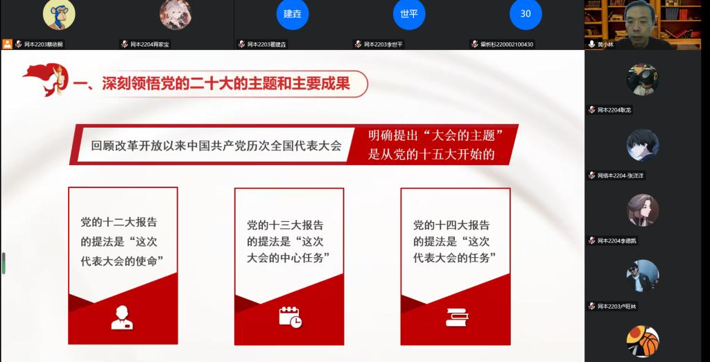 为深入学习宣传贯彻党的二十大精神,引导青年学生坚定不移听党话、跟党走,12月1日上午,系党总支书记黄小林通过参加线上主题班会的形式,为我系网络专业本科班的学生宣讲了党的二十大精神。
