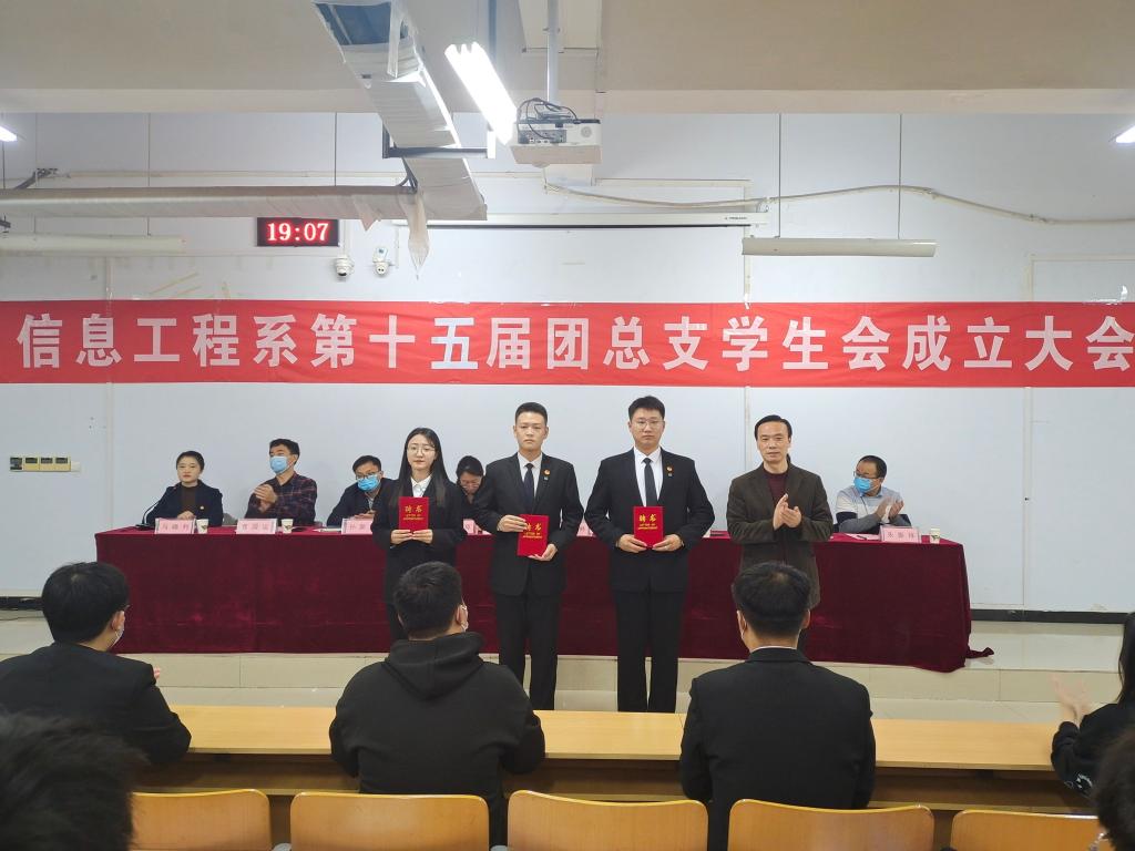 大会伊始,全体起立齐唱共青团团歌《光荣啊,中国共青团》,会议在庄严肃穆的气氛中拉开了帷幕。会上,武立博副书记宣读了《信息工程系关于第十五届团总支、学生会干部任命的决定》,李慧琼老师宣读了《信息工程系关于表彰2021级指导员、带班员突出贡献个人和优秀个人的决定》,与会领导、老师依次为第十五届团总支、学生会干部和2021级班委颁发了聘书,为2021级指导员、带班员突出贡献个人和优秀个人颁发了荣誉证书。随后,新任团总支副书记李佳欣同学代表新一届团总支、学生会作表态发言,对新学年团总支、学生会工作提出了规划和展望,表明了信心和决心。
