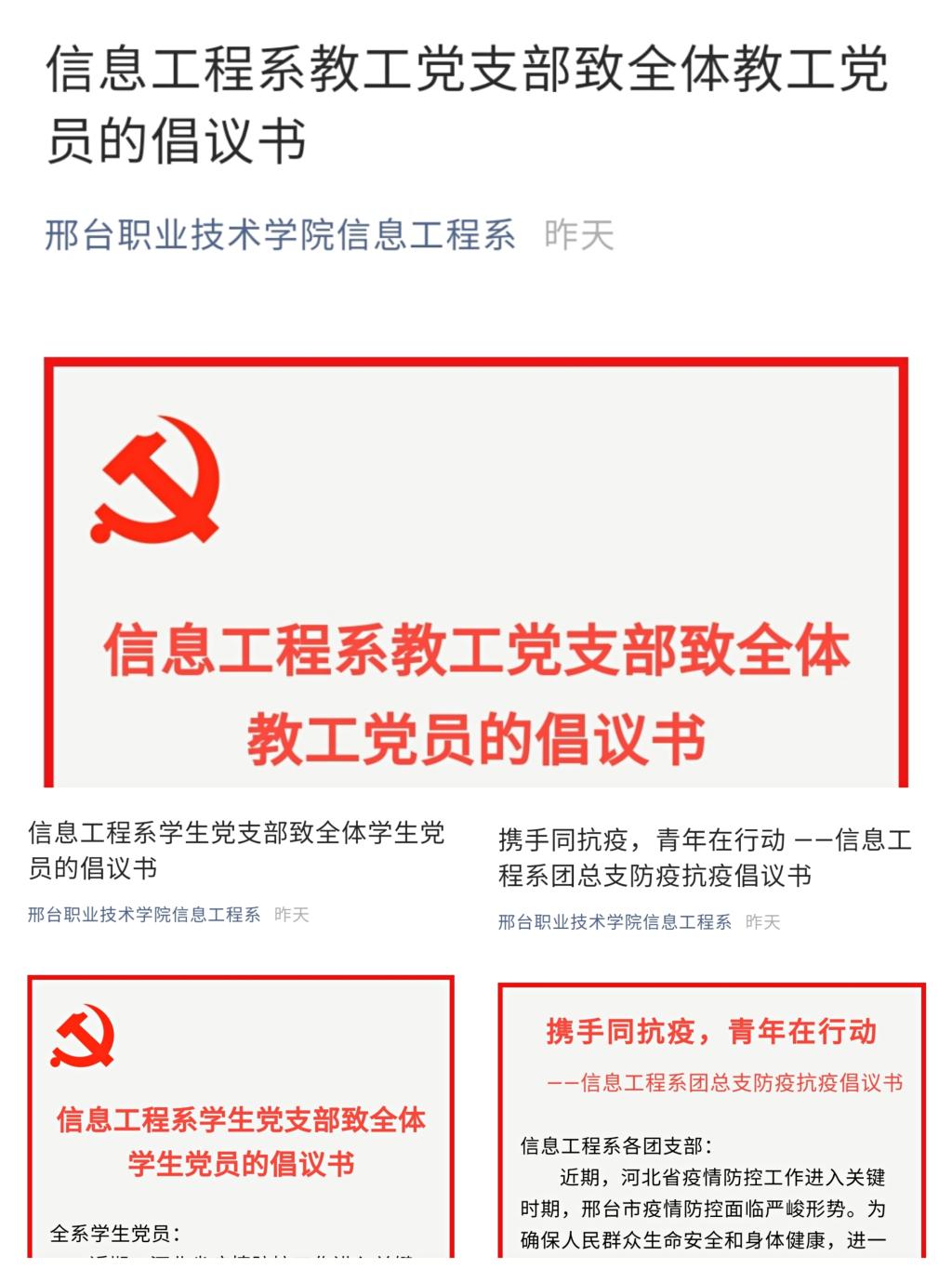近期,河北省疫情防控工作进入关键时期,邢台市疫情防控面临严峻形势。信息工程系党总支坚决贯彻学院党委决策部署,迅速行动,严抓落实,汇聚起防疫抗疫的磅礴力量。