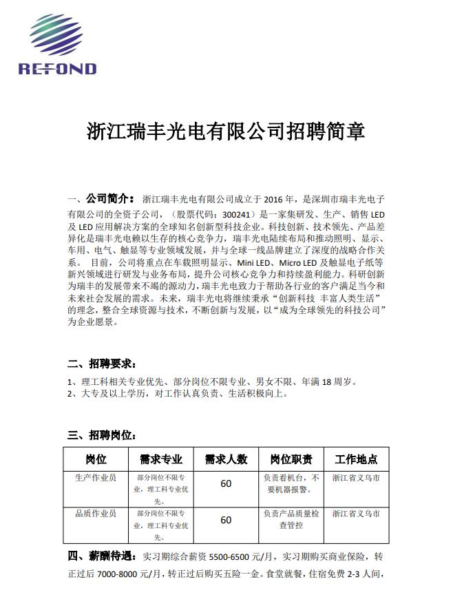 浙江瑞丰光电有限公司招聘简章