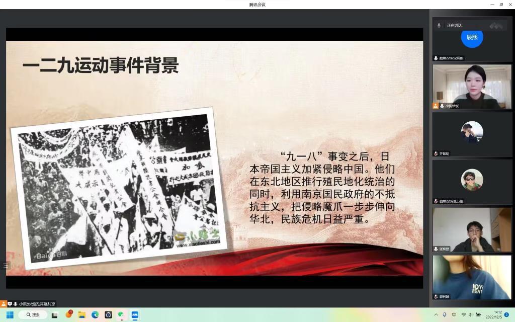 为纪念“一二九”运动75周年,弘扬艺术系学生的爱国主义精神,为向同学们传递“激情、责任、协作、创新”的精神,学习部开展“纪念‘一二九’运动”主题班会。