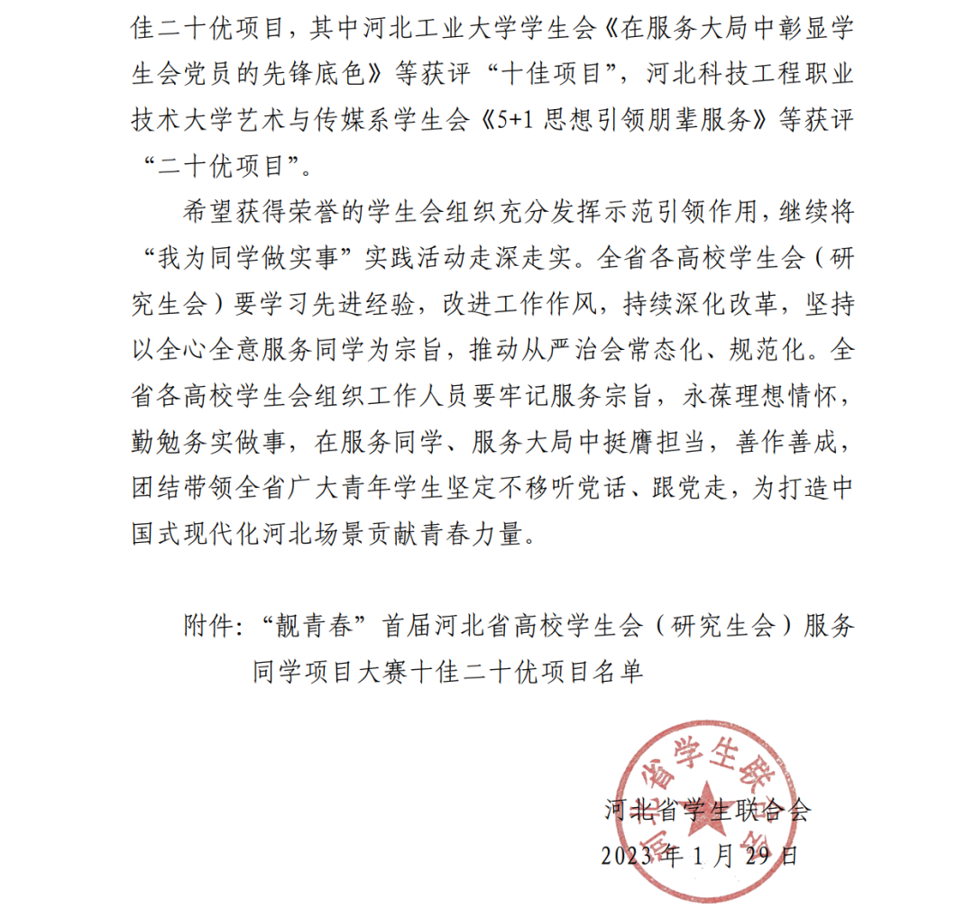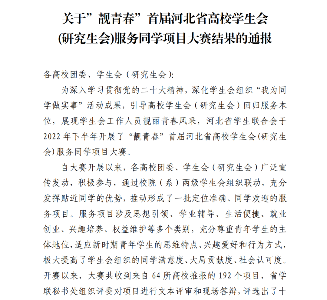 关于”靓青春”首届河北省高校学生会(研究生会)服务同学项目大赛结果的通报