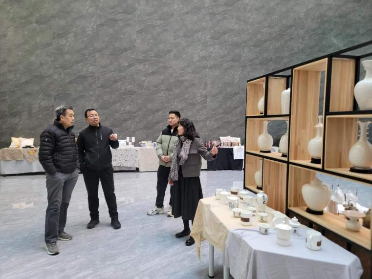 王处长一行参观了我系非遗传承创意中心的崖柏雕刻作品、邢瓷陶艺作品、蔚县剪纸作品、豆面印花等作品,并仔细了解了非遗作品宣传与创新现状。随后,张老师为王处长一行介绍了互联网+视觉设计、居住空间设计、虚拟交互研创实验室等工作室。王处长着重了解了各工作室的主要功能和运行模式,并对以工作室为教学基地、研究平台、辐射中心的办学理念给与高度认可。
