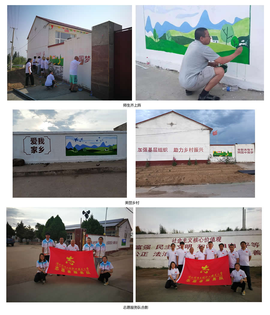6月28日—7月1日艺术与传媒系视觉传达专业与环境艺术设计专业5位学生志愿者,在尤春阳、钱立稳两位老师的带领下,前往best365定点扶贫村张家口市宣化区塔儿村乡西庄子村参加社会实践活动,主要任务是将村主干道两旁的墙面书写标语、绘制墙画,美化村居环境。