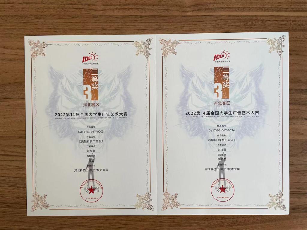 热烈祝贺我系全媒体广告策划与营销专业学子在2022年度第14届全国大学生广告艺术大赛河北赛区角逐中斩获两个类别共计17个奖项,其中包括一等奖4项,二等奖5项,三等奖2项,优秀奖6项,战果辉煌,收获颇丰!