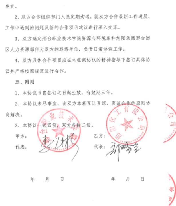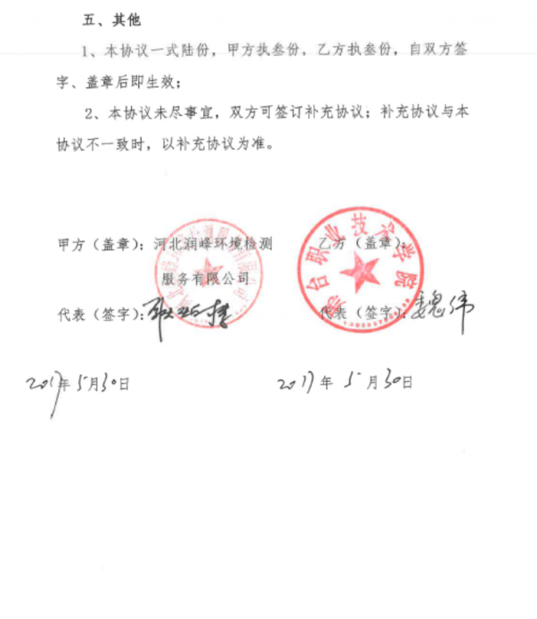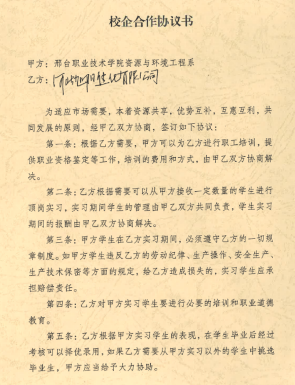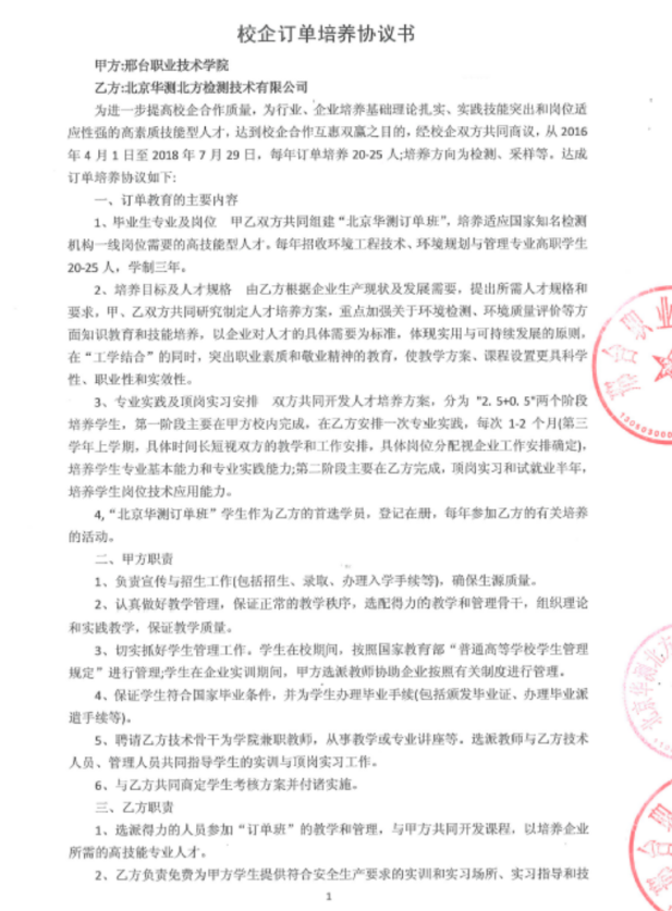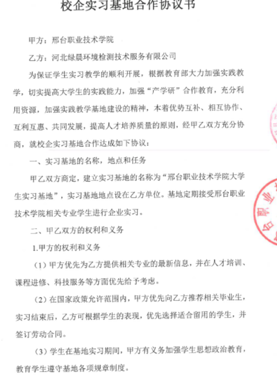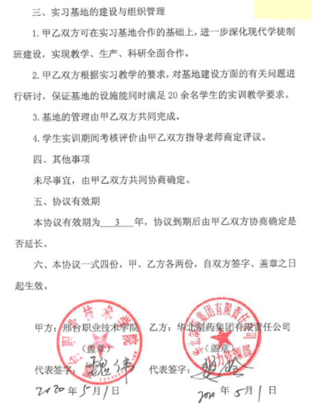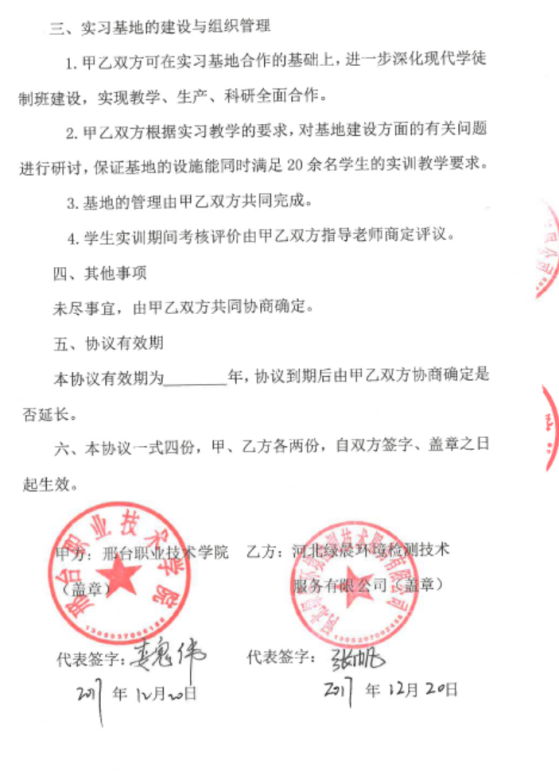 建立了28个基础较好、规模较大的校外实训基地:河北旭阳焦化有限公司实训基地、华北制药股份有限公司实训基地、河北润峰环境检测服务有限公司实训基地、北京京畿分析测试中心有限公司实训基地、旭阳化工有限公司实训基地、邢台市环境保护技术开发中心实训基地、河北绿晨环境检测技术服务有限公司实训基地、河北田加力生物科技股份有限公司实训基地、根力多生物科技股份有限公司实训基地等。现代学徒制对学生的实践能力要求比较高,校外实训基地能够为学生了解并理解企业经营流程提供真实的现场环境,通过对现场系统的操练和观察可以增强学生的学习兴趣,培养学生的应用能力,为更好的实践教学提供了基础。