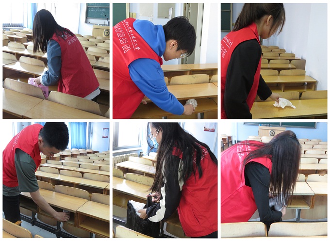 4月26日,志愿者们在主教、二教分别进行卫生清理,大家拿着垃圾袋捡拾同学们遗忘在书桌里、桌面上的垃圾并倒入垃圾桶,擦拭桌面灰尘、清理黑板粉笔印记、整理讲台物品,还重点对墙角、暖气等死角进行卫生清洁。同学们分工协作,经过一个小时的劳动,各个教室变得焕然一新。