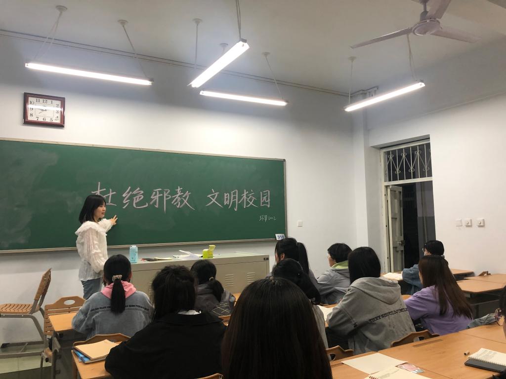 活动于19:30在二教准时开始,本次活动由各团支部的班长和团支书主持。首先,他们向同学们强调本次“反邪教宣传教育进校园”活动主题,向同学们诠释了反邪教的重要性。此后,各班开展了线上微信平台“反邪教”签字以及线下宣传条幅签字活动,让同学们将自己反邪教的决心与条幅内容融汇在一起。