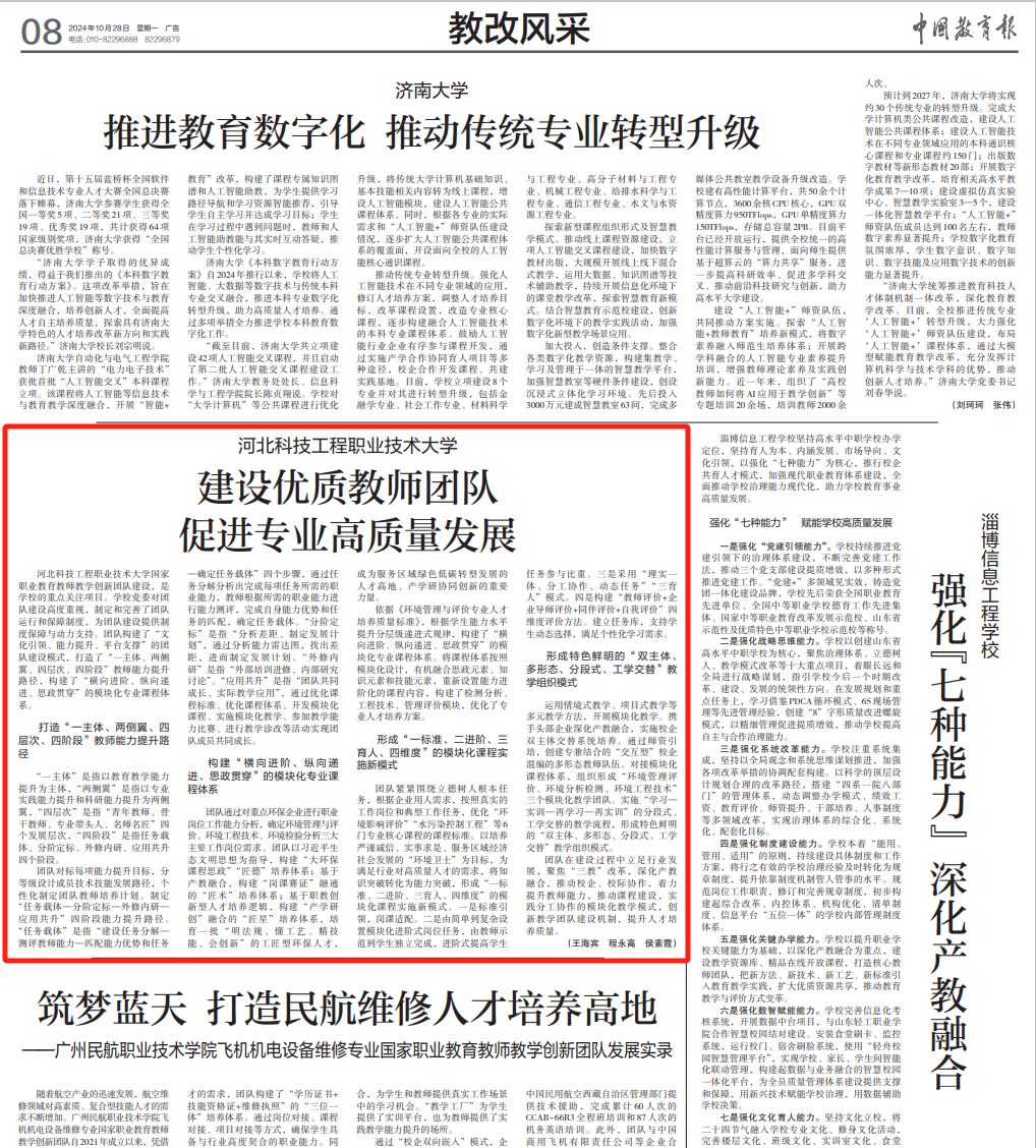 2024年10月28日,《中国教育报》以《建设优质教师团队 促进专业高质量发展》为题从教师能力提升路径、模块化课程建设及实施等不同内容角度,报道best365环境管理与评价专业国家级职业教育教师教学创新团队的优秀经验、路径和成果。报道刊发后,受到了教育同行的肯定和社会各界的广泛关注,为国家级职业教育教师教学创新团队建设工作奠定了坚实基础。