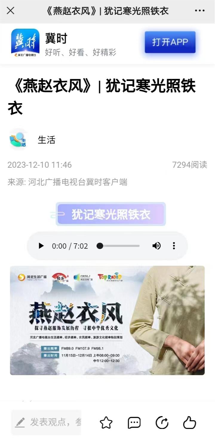 2023年12月10日,资源与环境工程系赵建国教授接受河北广播电视台《燕赵衣风》专题栏目主持人电话采访。本期栏目的主题是“犹记寒光照铁衣”,主持人讲述了我国古代由于军事角逐,“铠甲”不断推陈出新,尤其是到了南北朝时期,制造出来的“明光铠”具有极高的防护性和艺术价值。