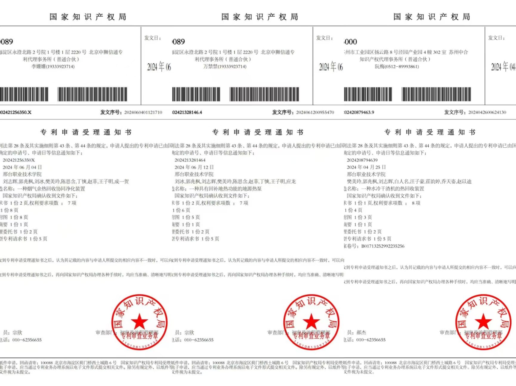 申请专利情况:《一种水冷干渣机的热回收装置》、《一种具有回补地热功能的地源热泵》、《一种烟气余热回收协同净化装置》